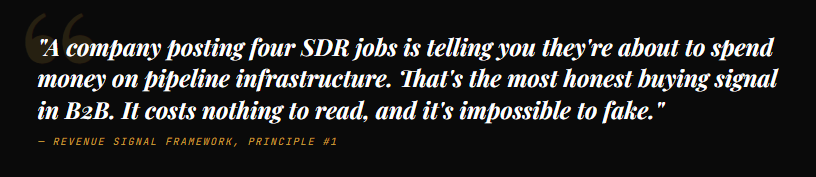 π‘ “A company posting 4 SDR jobs is telling you they’re about to spend money on pipeline. That’s the most honest buying signal in B2B β and it costs nothing to read.”