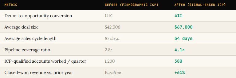 Days 22β30: Rewrite your ICP definition. Firmographics set the floor. Signal score of 20+ gets you in the room.